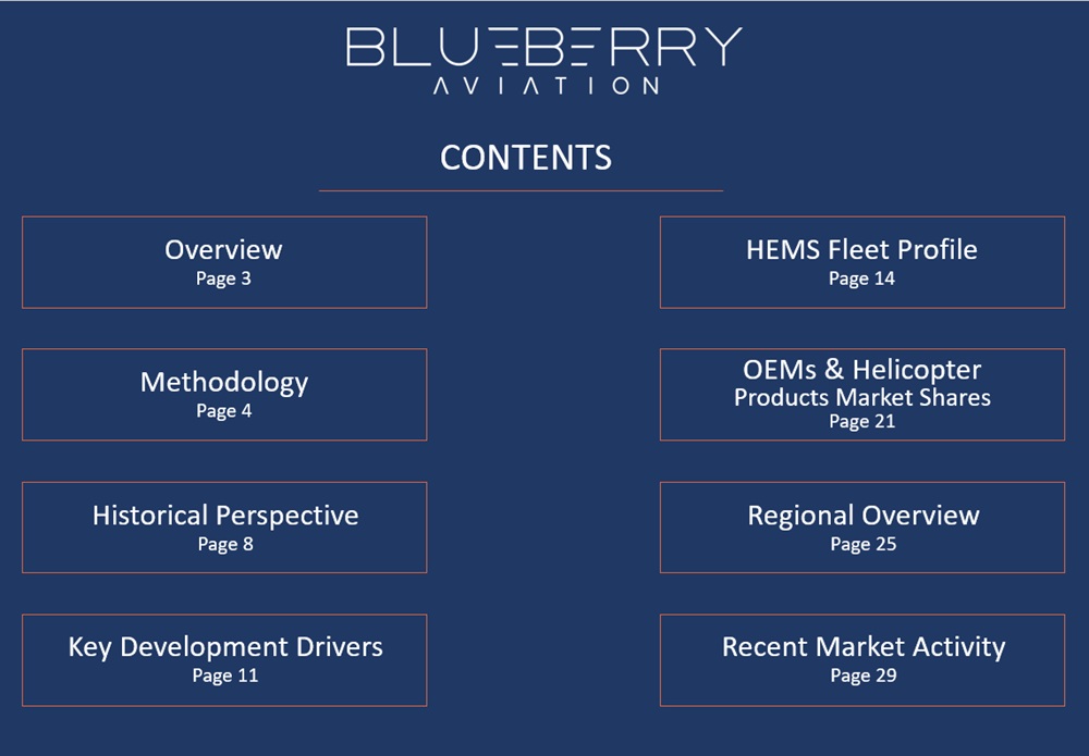 The 2025 Blueberry Aviation Report provides a comprehensive overview of the global Helicopter Emergency and Medical Services (HEMS) market, with the dual aim of bringing greater transparency to helicopter trading and guiding buyers and sellers in this complex sector. It examines the main drivers that encourage or slow the development of rotary wing ambulance services worldwide and evaluates the competitive standing of helicopters produced by leading Western manufacturers.